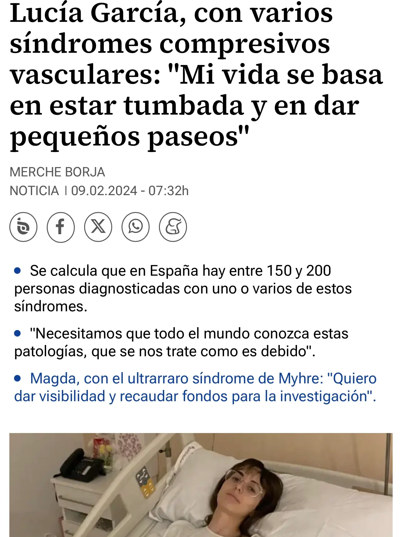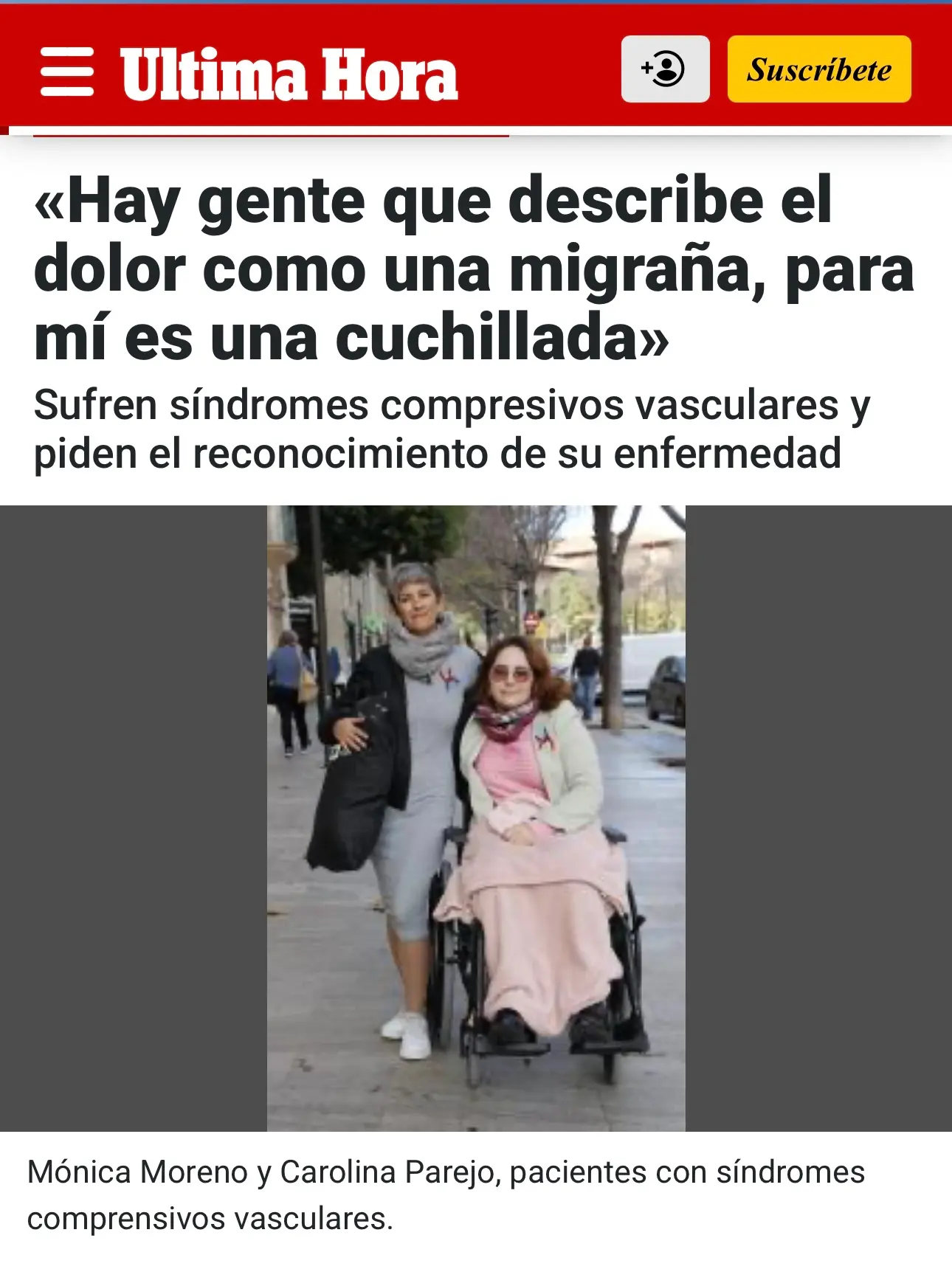 Teresa Martín, convive con varios Síndromes Compresivos Vasculares que han afectado gravemente a su salud y la han convertido en una persona dependiente con 34 años. “Pedimos al menos una unidad en la Seguridad Social dedicada a estos síndromes, porque a día de hoy no la hay y tenemos que recurrir a la sanidad privada”
