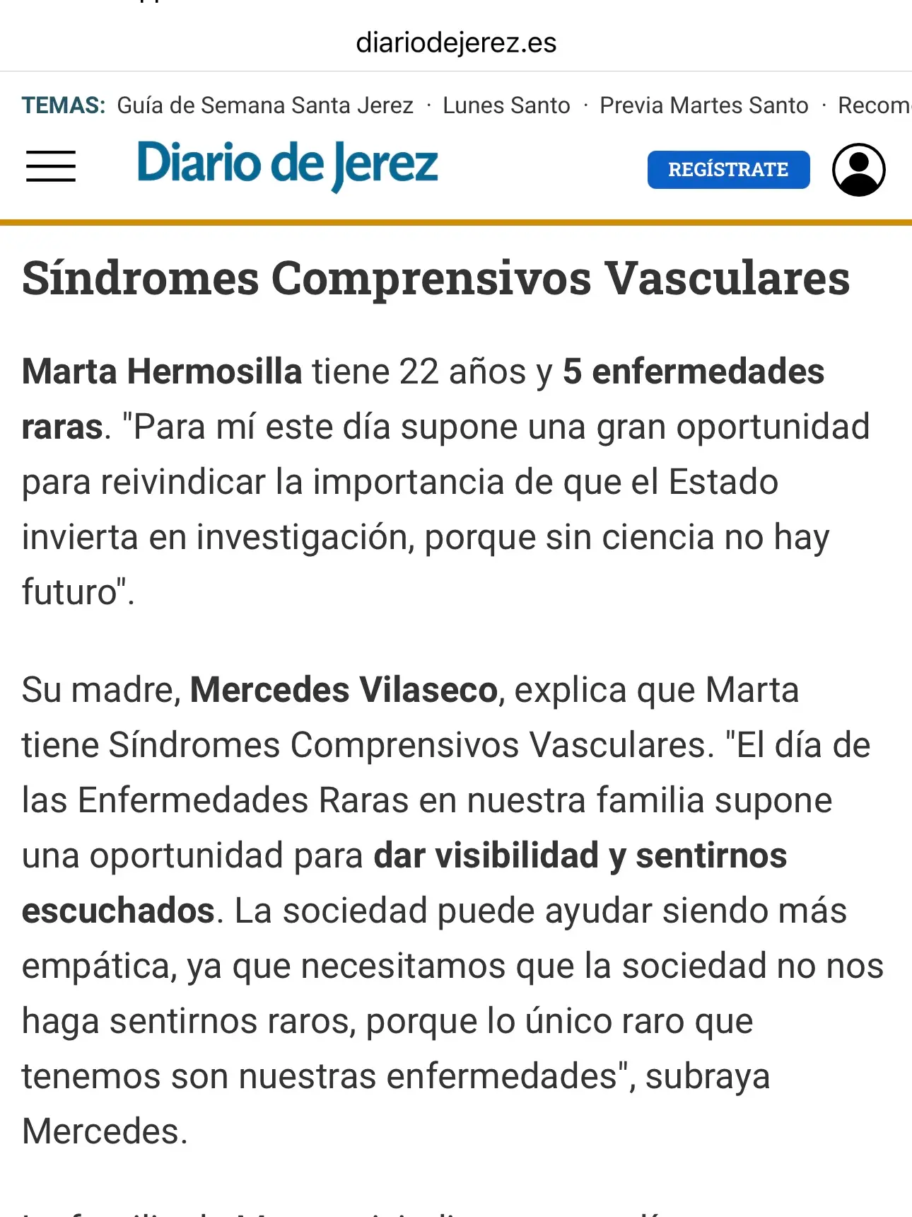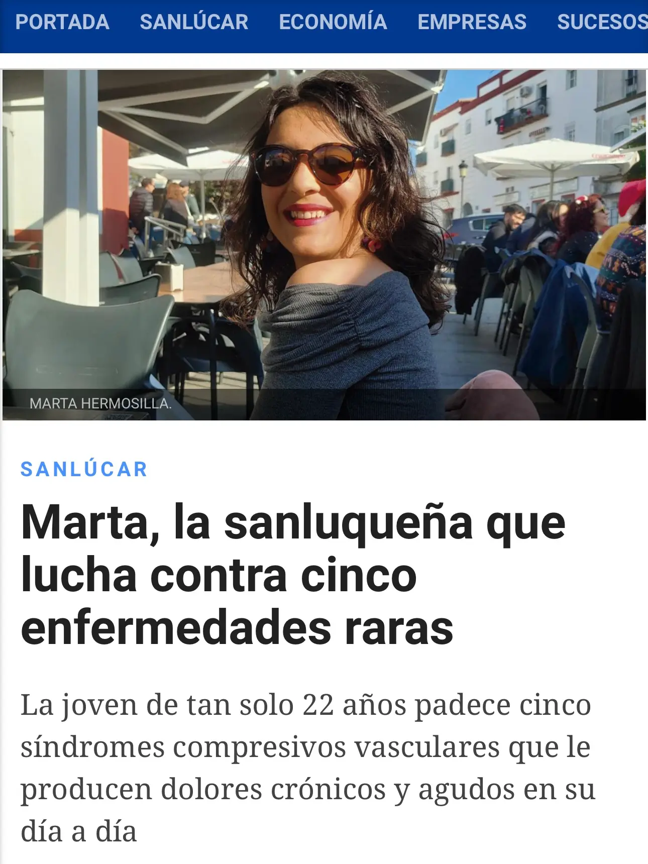 Marta Hermosilla, sanluqueña de 22 años, Secretaria de AESCOV y paciente de Síndromes Compresivos Vasculares, es entrevistada en el periódico Sanlucar Información, para dar visibilidad a estas enfermedades raras y explicar la necesidad de crear la asociación para dar voz a los pacientes y reclamar unidades especializadas.